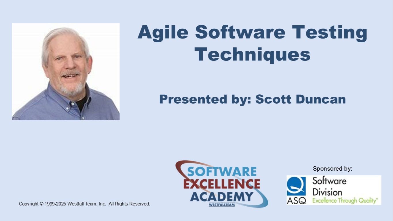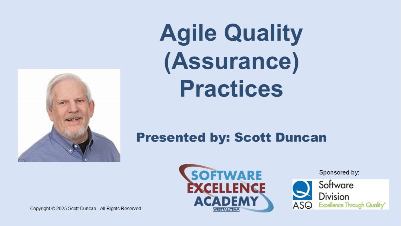 Scott Duncan will speak on how Agile practices can contribute to quality, especially its assurance. Scott has presented this before, but will offer different perspectives from what he has in the past given the evolution in team behaviors. Included will be some thoughts about four things to consider, even before adopting Agile practices.